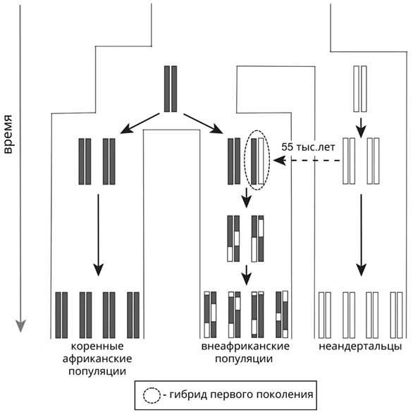 Примерно 55 тыс. лет назад предки современного человека, выходившие из Африки, скрещивались с неандертальцами, поэтому в геноме современных людей имеется 2-3% неандертальской ДНК. Какой должна быть доля неандертальской ДНК у гибридов первого поколения неандертальцев и людей? Известно, что доля неандертальской ДНК постепенно уменьшается и распределяется между хромосомами, при условии, что гибриды скрещиваются дальше исключительно с людьми. За счет какого процесса происходило распределение (перемешивание) неандертальской ДНК между гомологичными хромосомами? Некоторые аллели, связанные с адаптацией к холодному климату в геноме современного человека имеют неандертальское происхождение. Почему эти аллели раньше возникли у неандертальцев и были унаследованы предками современных людей? К какой группе движущих сил (факторов) антропогенеза относится данный пример?
