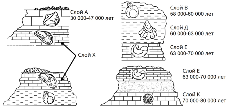 Одним из способов определения возраста осадочных пород является биостратиграфический. Для нескольких разрезов осадочных пород был определен абсолютный возраст слоев. В каждом слое обнаруживается характерное ископаемое. Какой интервал соответствует возрасту слоя Х? Ответ поясните. Какой метод чаще всего используется для абсолютного датирования пород? Опишите принцип этого метода. Какое вещество преобладает в данных осадочных породах?