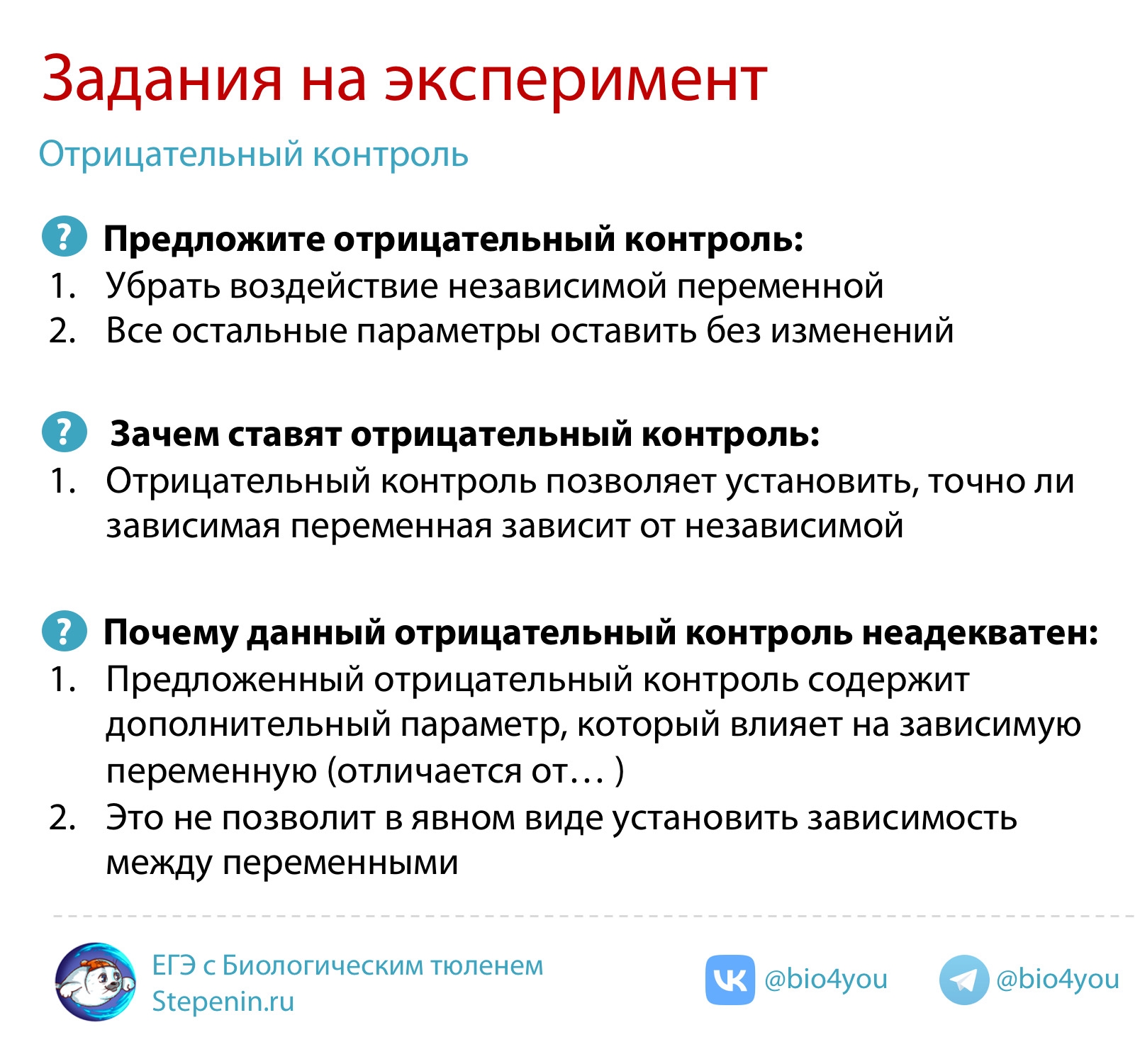 Какая переменная в этом эксперименте будет независимой (задаваемой), а какая − зависимой (изменяющейся)? Какие два условия должны выполняться при постановке отрицательного контроля*? С какой целью необходимо осуществлять такой контроль?