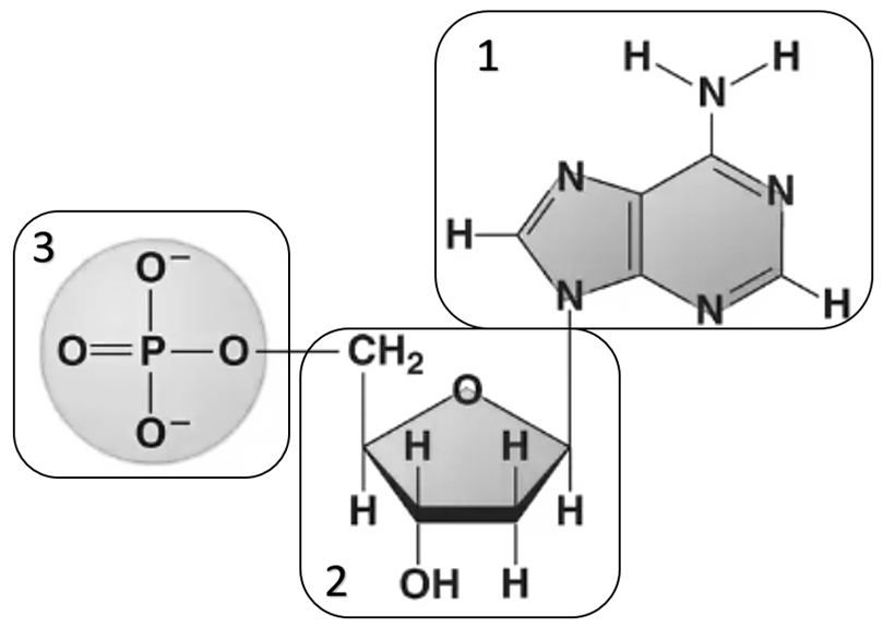 Как называется молекула, изображенная на рисунке? Мономером какой молекулы она является? Назовите два матричных процесса, в которых данная молекула участвует непосредственно. Цифрой 2 обозначен остаток моносахарида. Запишите его название.