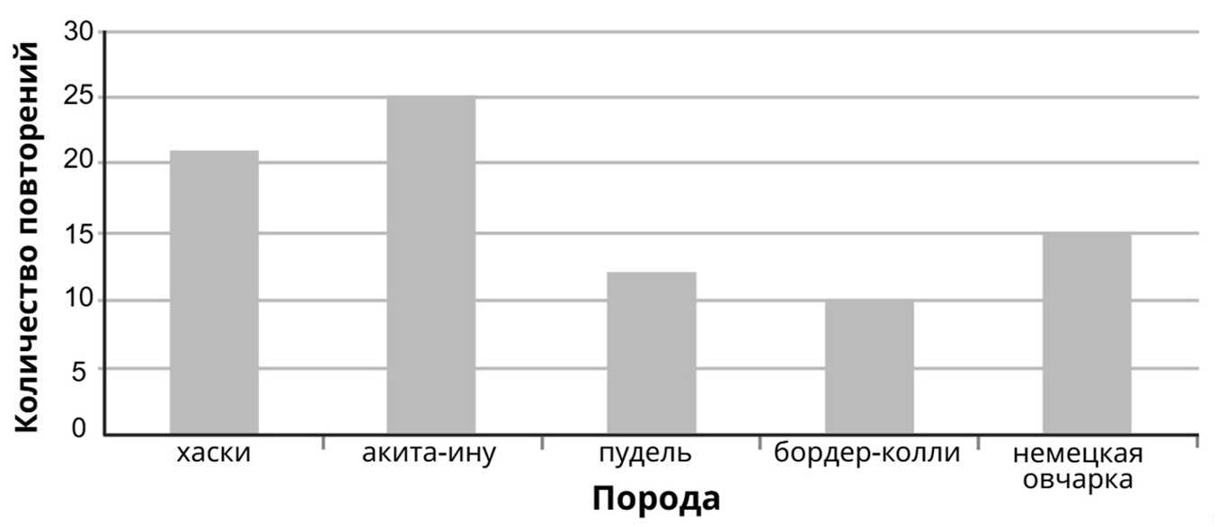 Экспериментатор изучал способность собак к дрессировке. Для этого он подсчитывал, сколько повторений потребуется собакам разных пород для уверенного выполнения команды «лежать». Результаты эксперимента представлены на диаграмме.