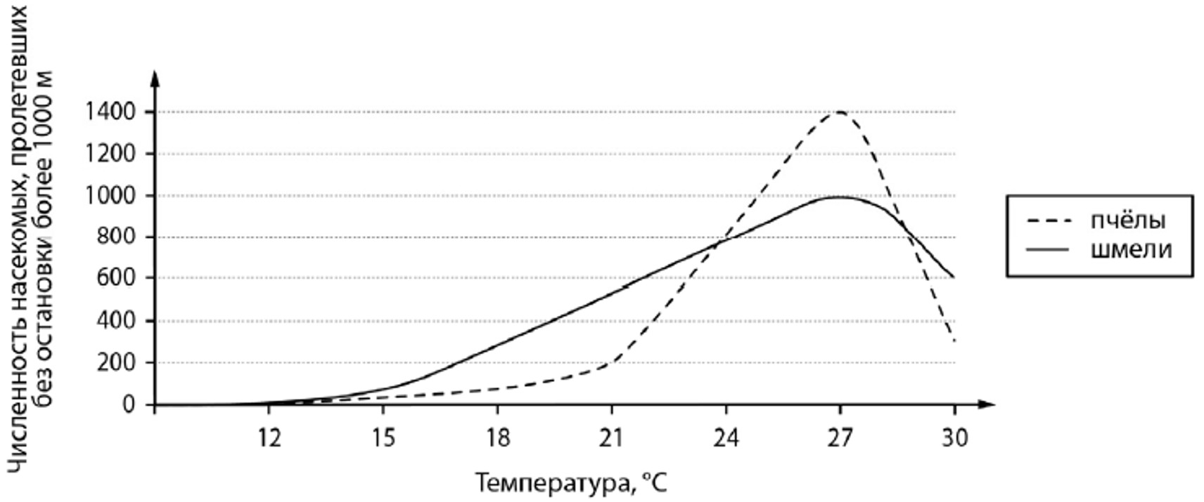 Экспериментатор изучал особенности физиологии и поведения шмелей и пчел. Для этого их помещали в герметичные прозрачные камеры с возможностью регулировки температуры, ставили на насекомых магнитные метки и при помощи датчиков регистрировали скорость и продолжительность полета (без посадки). Затем высчитывали дальность полета. Результаты представлены на графике.