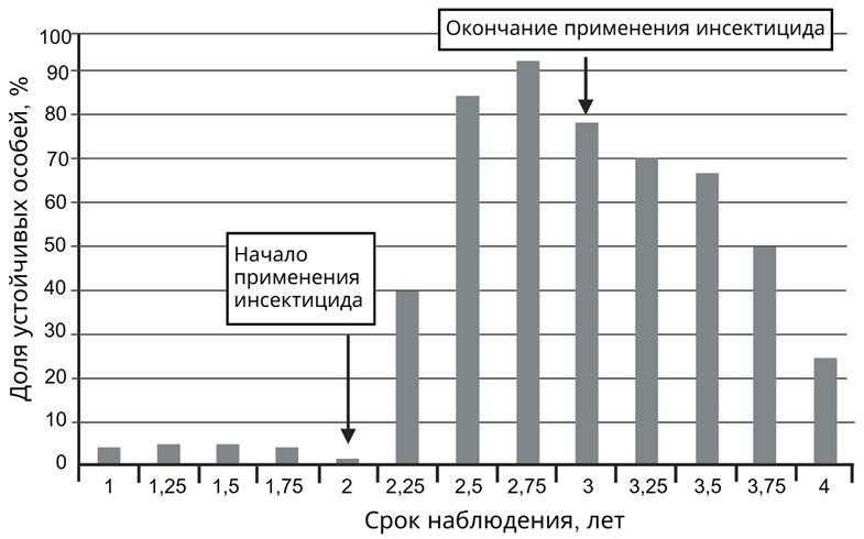 Экспериментатор изучал развитие устойчивости популяции рыжего таракана (Blattella germanica) к инсектициду хлорпирифосу. Результаты эксперимента приведены на диаграмме.