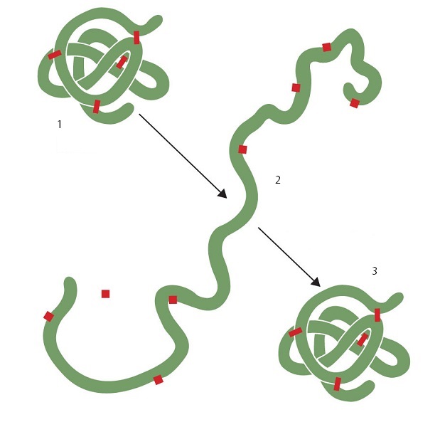 - Ренатурация белка - восстановление структуры белка после его денатурации. Возможна только при обратимой денатурации.