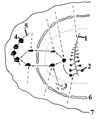 Установите соответствие между характеристиками структур и их обозначениями, приведенными в виде цифр на схеме: к каждой позиции, данной в первом столбце, подберите соответствующую позицию из второго столбца.
