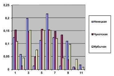 Рассмотрите гистограмму «Графическое отображение частот фрагментов ДНК у оленей эвенской породы (Ирбычан) в сравнении с чукотской и ненецкой». Выберите утверждения, которые можно сформулировать на основании анализа представленных данных. Запишите в ответе цифры, под которыми указаны выбранные утверждения.