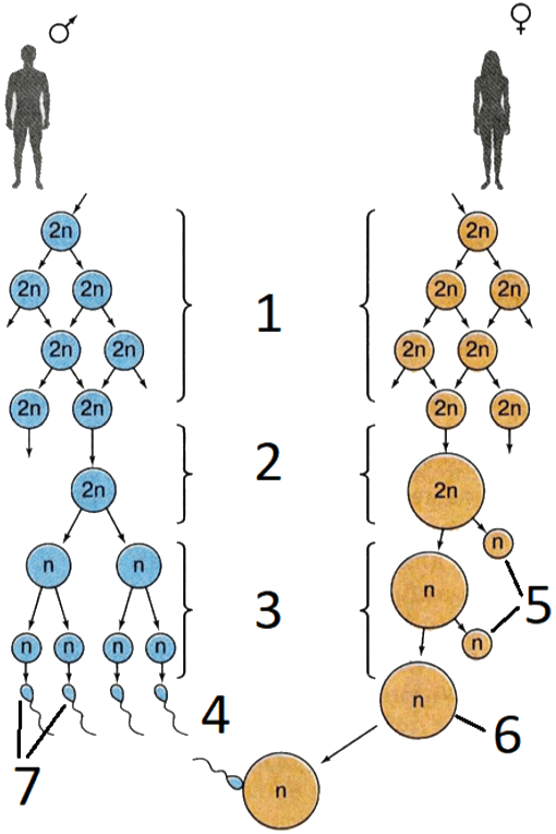 Установите соответствие между характеристиками и этапами гаметогенеза, обозначенными на схеме цифрами 1, 2, 3: к каждой позиции, данной в первом столбце, подберите соответствующую позицию из второго столбца.