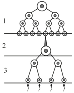 Установите соответствие между характеристиками и стадиями гаметогенеза, обозначенными на рисунке цифрами 1, 2 и 3: к каждой позиции, данной в первом столбце, подберите соответствующую позицию из второго столбца.