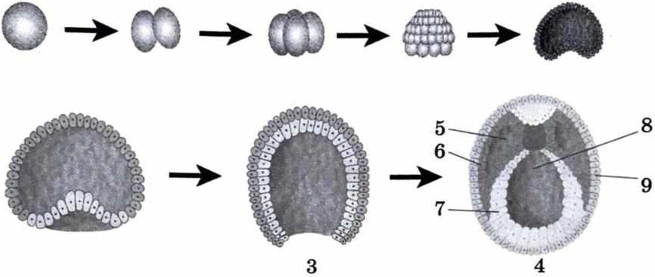 Каким номером на схеме эмбриогенеза обозначена вторичная полость тела будущего животного?
