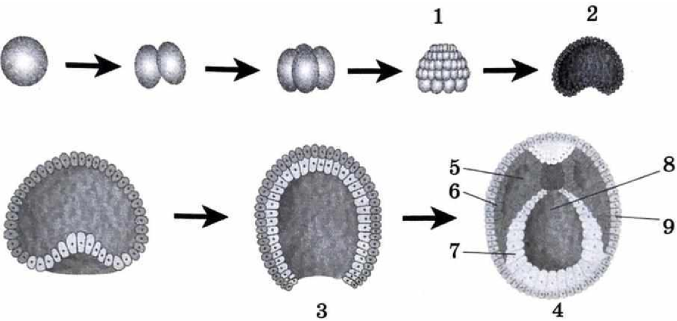 Установите соответствие между признаками и стадиями эмбриогенеза и структурами зародыша, обозначенными цифрами на схеме: к каждой позиции, данной в первом столбце, подберите соответствующую позицию из второго столбца.