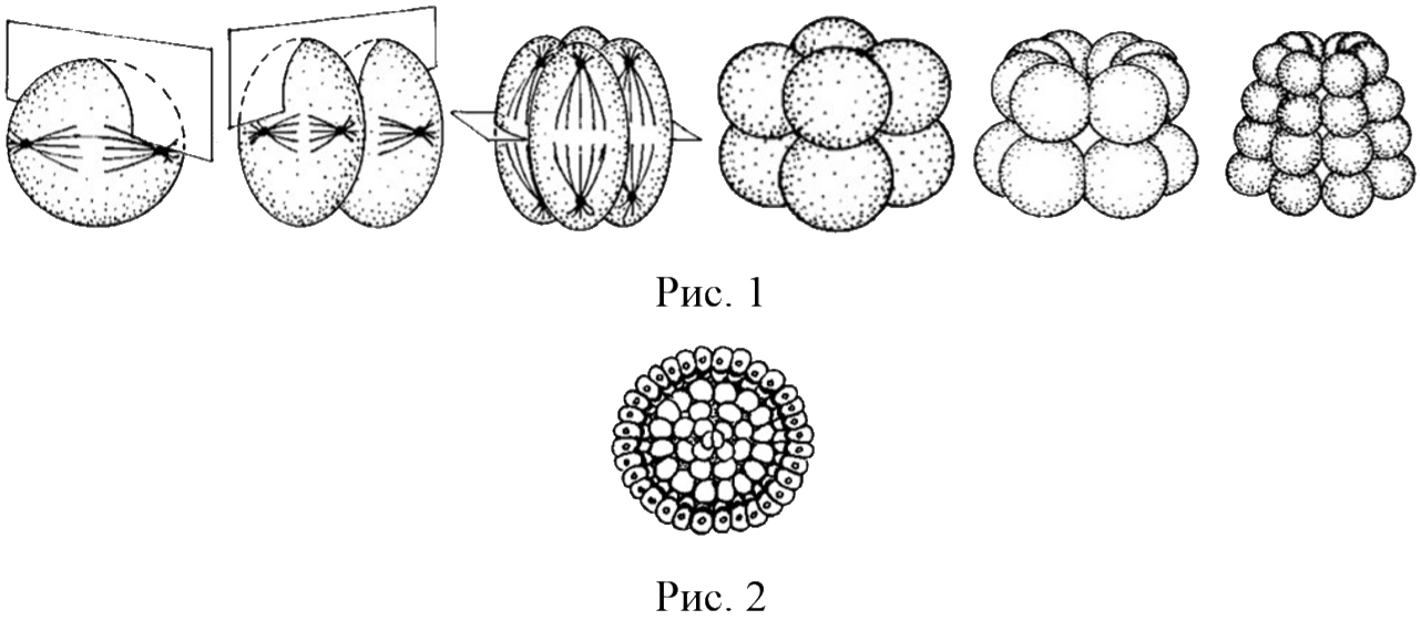 Какой этап эмбриогенеза ланцетника представлен на рисунке 1? Какую особенность имеет деление клеток в этот период? На рисунке 2 представлена стадия, которой завершается этот процесс. Как она называется? Какие особенности строения и размера (относительно зиготы) она имеет?