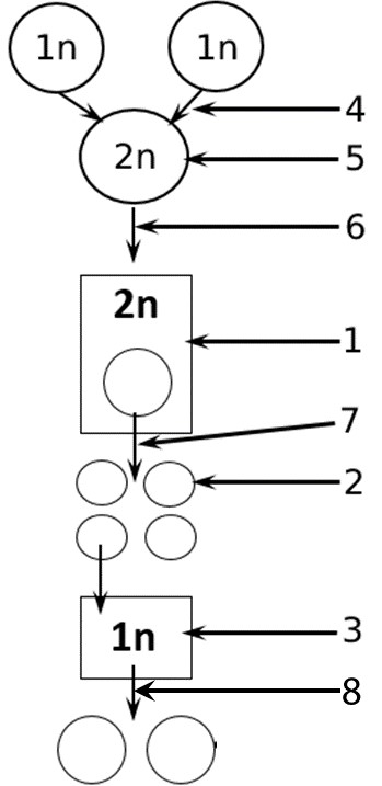 Установите соответствие между характеристиками и этапами жизненного цикла организма, обозначенными цифрами на схеме: к каждой позиции, данной в первом столбце, подберите соответствующую позицию из второго столбца.