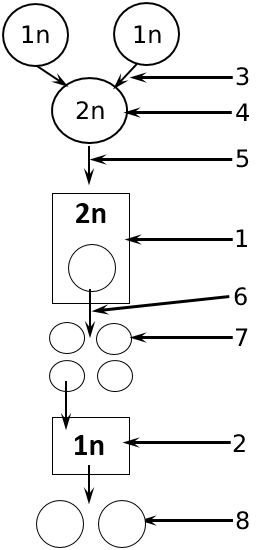 Установите соответствие между характеристиками и этапами жизненного цикла организма, обозначенными цифрами на схеме: к каждой позиции, данной в первом столбце, подберите соответствующую позицию из второго столбца.